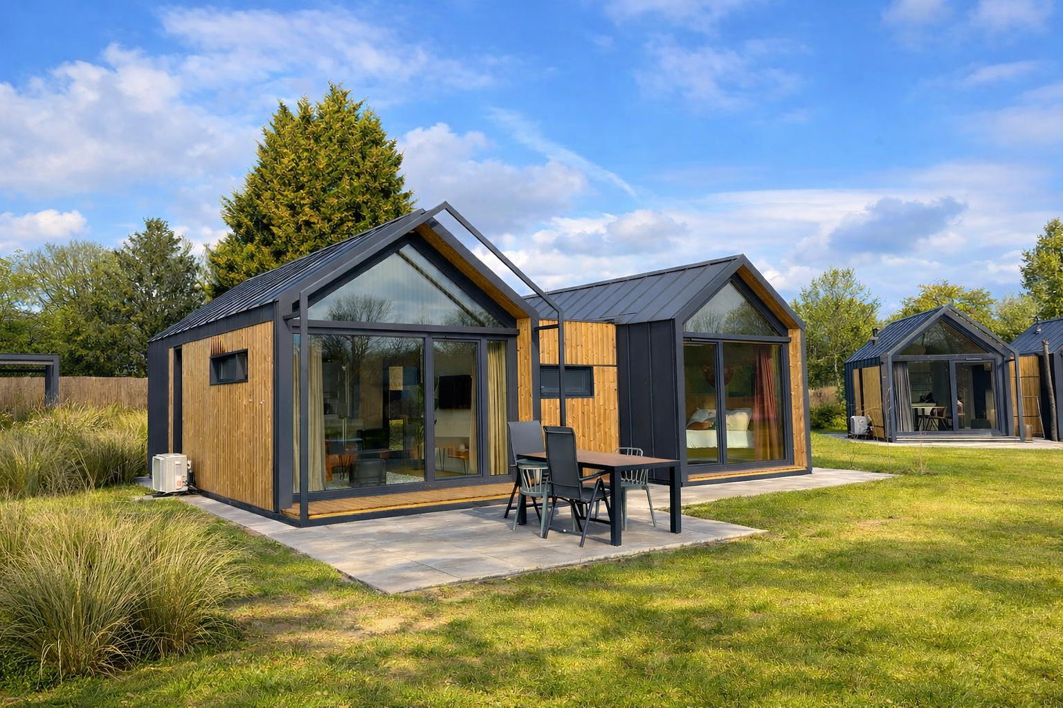 Er is gebruik gemaakt van degelijke, onderhoudsvriendelijke materialen met het oog op een duurzaam profijt van de recreatiewoning. Ook heeft deze family lodge een hoogwaardige gevelbekleding van hout voor een natuurlijke look en feel. De ruime glaspartijen geven een lichte, moderne en luxe uitstraling.